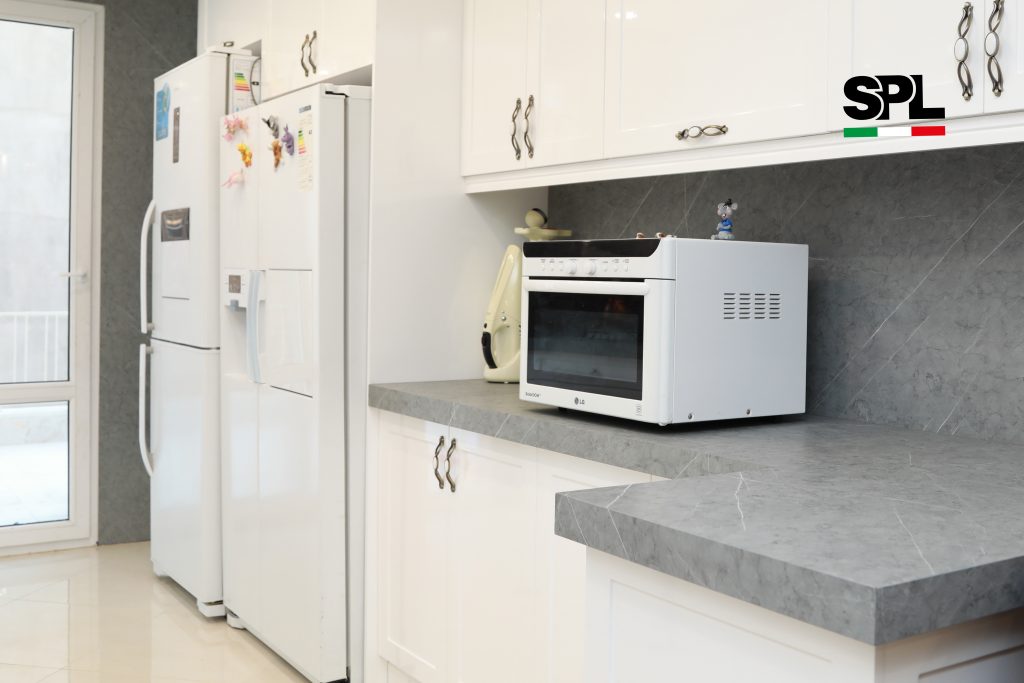 استفاده از رنگ های روشن و براق باعث انعکاس نور بیشتر در آشپزخانه می شود. بنابراین برای اینکه آشپزخانه بزرگتر و روشن تر به نظر برسد باید از رنگ روشن تر SPL و Marmonite استفاده کنید تا فضا باز و روشن به نظر برسد.